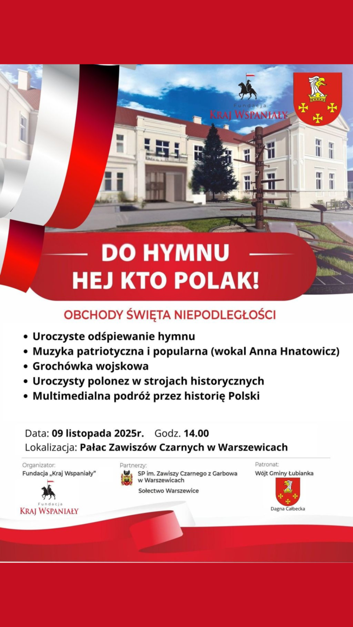- 9 listopada 2025 r. Do Hymnu Hej kto Polak w pałacu w Warszewicach,